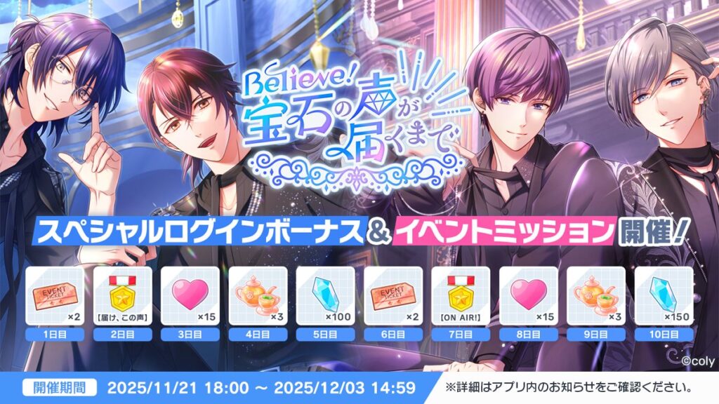11月21日18:00からイベント【Believe!宝石の声が届くまで】がスタート予定!ガチャにはUR青山・桧山・大谷・神楽・槙・京介のカードが登場!