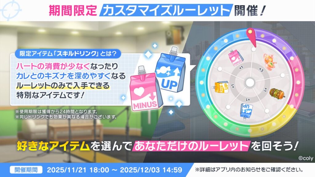 コラボ限定のSRアイテムや、スキルドリンクなど自分の好きなアイテムを選択してルーレットを回そう!